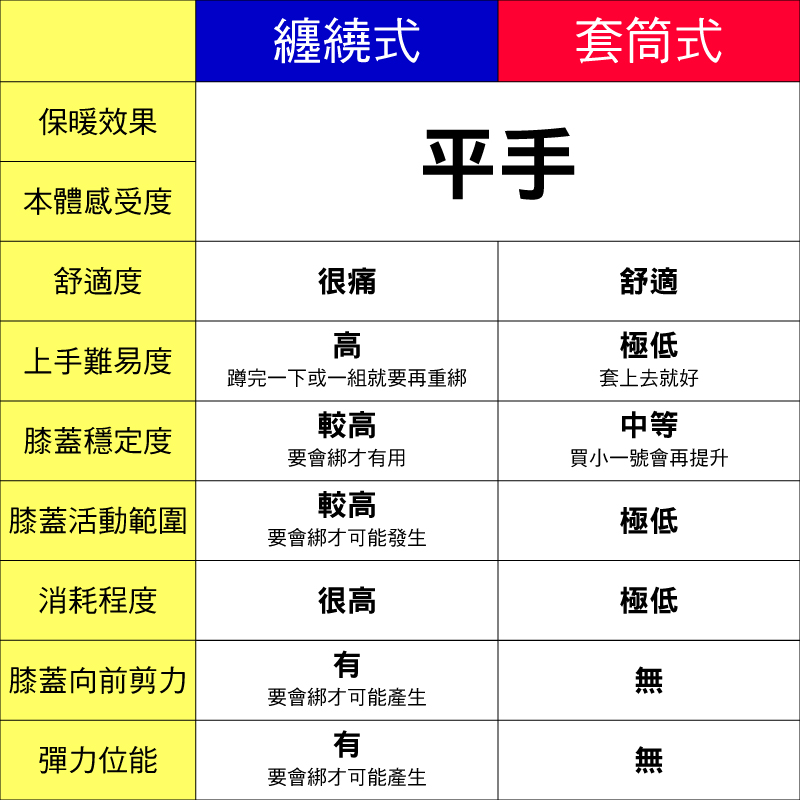 ◎ 限制膝蓋活動範圍:纏繞式>套筒式 (這兩個的下蹲方式也會有不同唷!請去問專業的教練)